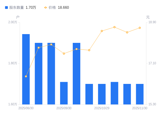 近一年(2024年12月20日至2025年10月31日),中荣股份A股股东户数从1.96万户,减低至1.71万户,降幅12.79%,区间股价上涨11.57%。
