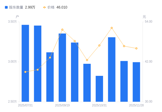 近一年(2024年12月10日至2025年11月28日),意华股份A股股东户数从3.48万户,减低至2.99万户,降幅14.07%,区间股价上涨14.17%。