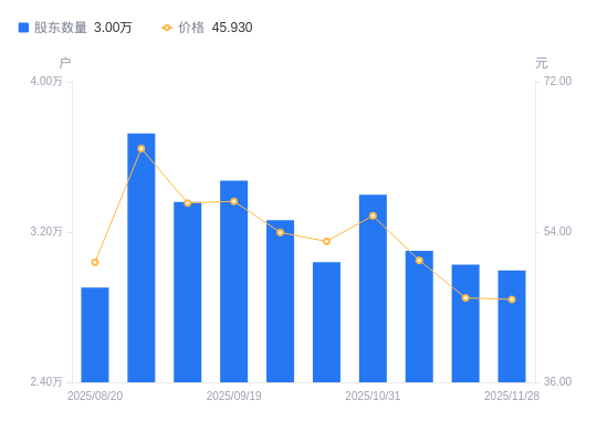 近一年(2024年12月31日至2025年11月28日),慧博云通A股股东户数从4.82万户,减低至3万户,降幅37.90%,区间股价上涨60.54%。