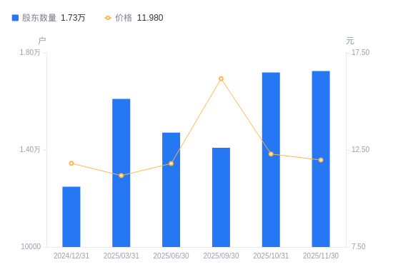 近一年(2024年12月31日至2025年11月30日),佳发教育A股股东户数从1.25万户,增加至1.73万户,增幅38.17%,区间股价上涨0.08%。