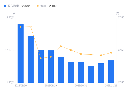 近一年(2024年11月29日至2025年11月28日),航天彩虹A股股东户数从10.34万户,增加至12.3万户,增幅18.94%,区间股价上涨14.69%。
