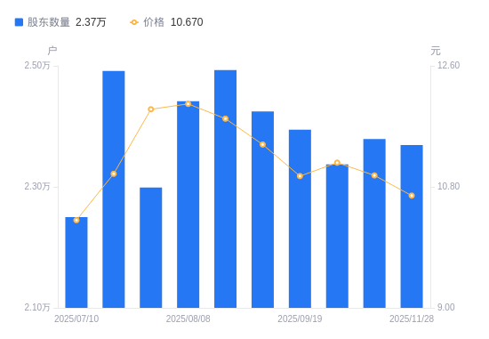 近一年(2024年12月31日至2025年11月28日),道道全A股股东户数从2.45万户,减低至2.37万户,降幅3.40%,区间股价上涨30.98%。