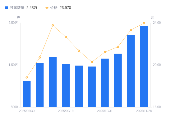 近一年(2024年11月29日至2025年11月28日),国安达A股股东户数从1.03万户,增加至2.43万户,增幅136.77%,区间股价上涨30.63%。