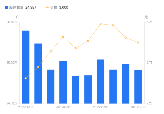 近一年(2024年12月10日至2025年12月10日),钒钛股份A股股东户数从30.21万户,减低至24.98万户,降幅17.31%,区间股价下跌10.71%。