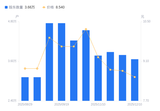 近一年(2024年12月10日至2025年12月10日),正业科技A股股东户数从2.36万户,增加至3.66万户,增幅55.03%,区间股价上涨21.65%。