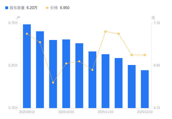 近一年(2024年12月10日至2025年12月10日),国投丰乐A股股东户数从6.61万户,减低至6.2万户,降幅6.21%,区间股价下跌7.21%。