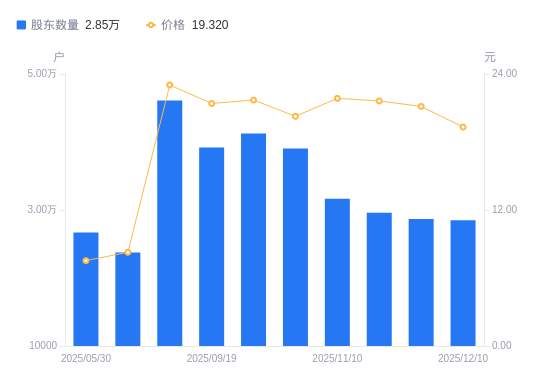 近一年(2024年12月20日至2025年12月10日),东杰智能A股股东户数从2.73万户,增加至2.85万户,增幅4.27%,区间股价上涨155.56%。