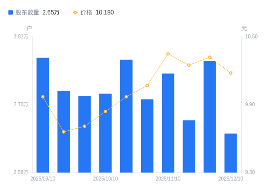 近一年(2024年12月10日至2025年12月10日),陇神戎发A股股东户数从2.88万户,减低至2.65万户,降幅8.09%,区间股价上涨3.46%。