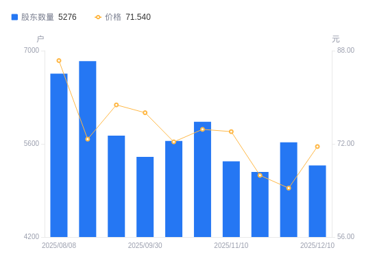 近一年(2024年12月31日至2025年12月10日),慧辰股份A股股东户数从3701户,增加至5276户,增幅42.56%,区间股价上涨104.11%。