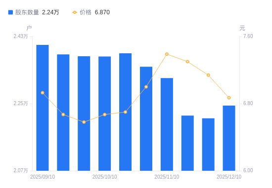 近一年(2024年12月10日至2025年12月10日),天禾股份A股股东户数从3.86万户,减低至2.24万户,降幅41.81%,区间股价上涨1.69%。