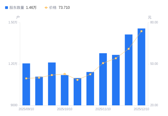 近一年(2024年12月20日至2025年12月10日),亚翔集成A股股东户数从1.69万户,减低至1.46万户,降幅13.88%,区间股价上涨195.43%。