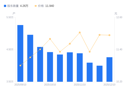 近一年(2024年12月10日至2025年12月10日),金智科技A股股东户数从4.91万户,减低至4.26万户,降幅13.19%,区间股价上涨31.72%。