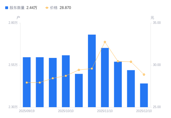 近一年(2024年12月10日至2025年12月10日),中新赛克A股股东户数从2.61万户,减低至2.44万户,降幅6.37%,区间股价上涨0.38%。