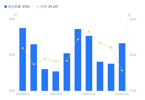 近一年(2024年12月20日至2025年12月10日),研奥股份A股股东户数从9971户,减低至8333户,降幅16.43%,区间股价上涨19.70%。