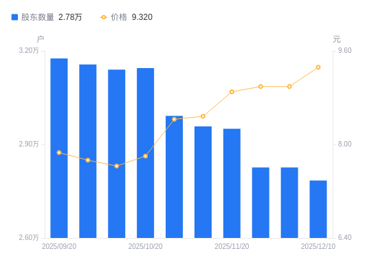 近一年(2024年12月10日至2025年12月10日),隆基机械A股股东户数从3.4万户,减低至2.78万户,降幅18.16%,区间股价上涨28.02%。