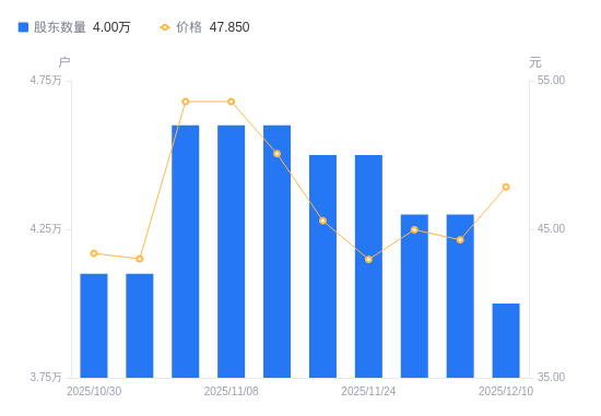 近一年(2024年12月20日至2025年12月10日),科士达A股股东户数从6.3万户,减低至4万户,降幅36.51%,区间股价上涨148.83%。