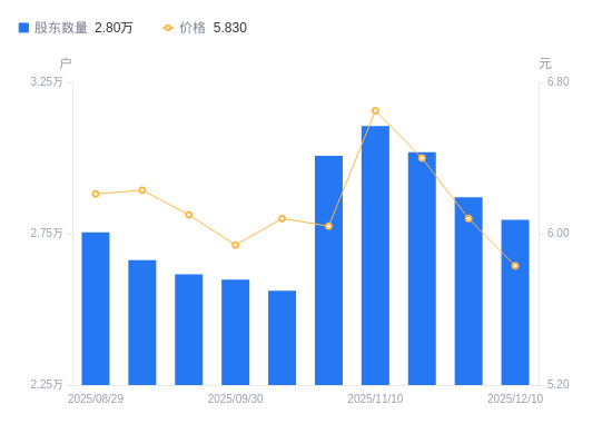 近一年(2024年12月10日至2025年12月10日),长青股份A股股东户数从2.57万户,增加至2.8万户,增幅8.71%,区间股价上涨5.42%。