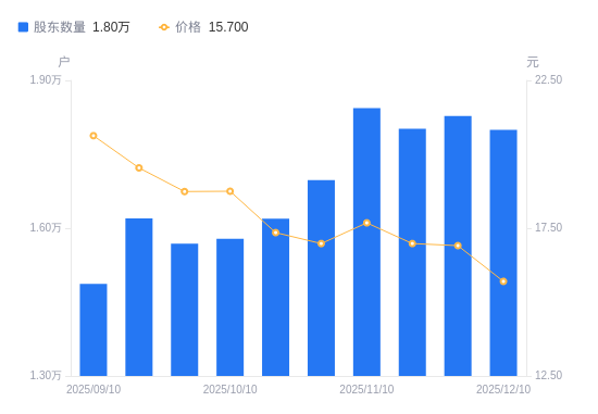 12月11日消息,数据显示,截至2025年12月10日,安利股份A股股东总户数为1.8万户,较上期(2025年11月28日)减少279户,降幅1.53%。公司最新A股总股本为2.17亿股,其中流通A股2.16亿股,户均持有流通A股数量为1.2万股,较上期增加183.44股,增幅1.55%;户均持流通A股市值18.87万元,较上期减少1.14万元,降幅5.72%。