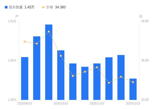 近一年(2024年12月31日至2025年12月10日),世纪恒通A股股东户数从1.71万户,减低至1.45万户,降幅15.29%,区间股价下跌10.45%。