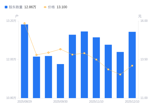 近一年(2024年12月10日至2025年12月10日),中科三环A股股东户数从10.89万户,增加至12.86万户,增幅18.11%,区间股价上涨18.87%。
