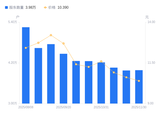 12月12日消息,数据显示,截至2025年11月30日,睿智医药A股股东总户数为3.98万户,较上期(2025年11月20日)增加91户,增幅0.23%。公司最新A股总股本为4.98亿股,其中流通A股4.75亿股,户均持有流通A股数量为1.19万股,较上期减少27.26股,降幅0.23%;户均持流通A股市值12.37万元,较上期减少2909.53元,降幅2.30%。
