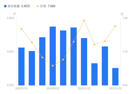 近一年(2024年12月10日至2025年12月10日),闰土股份A股股东户数从3.2万户,增加至3.45万户,增幅7.80%,区间股价上涨12.58%。