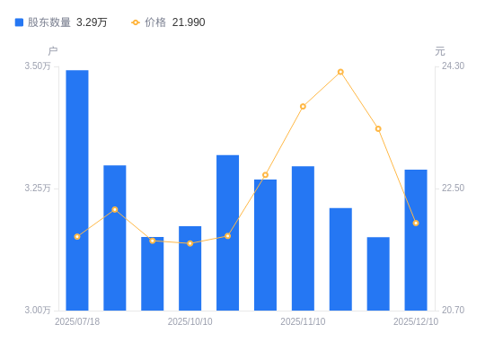 近一年(2024年12月10日至2025年12月10日),坚朗五金A股股东户数从2.96万户,增加至3.29万户,增幅11.16%,区间股价下跌17.77%。