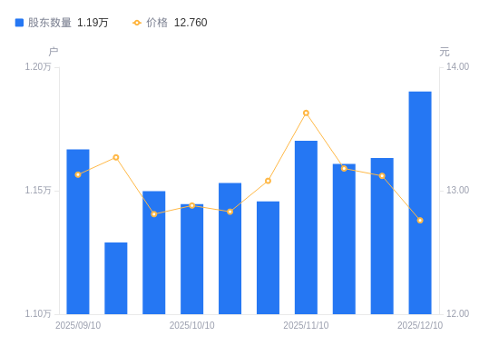 近一年(2024年12月20日至2025年12月10日),洪汇新材A股股东户数从1.07万户,增加至1.19万户,增幅11.58%,区间股价下跌1.86%。