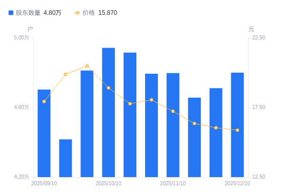 近一年(2024年12月10日至2025年12月10日),新时达A股股东户数从9.06万户,减低至4.8万户,降幅47.02%,区间股价上涨39.21%。