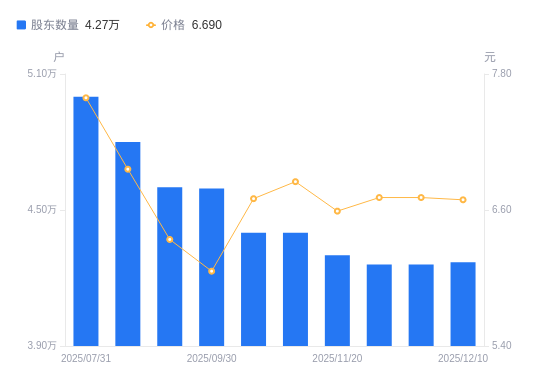 近一年(2024年12月20日至2025年12月10日),*ST椰岛A股股东户数从7.53万户,减低至4.27万户,降幅43.29%,区间股价下跌22.48%。