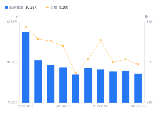 近一年(2024年12月20日至2025年12月10日),誉衡药业A股股东户数从9.49万户,增加至10.29万户,增幅8.43%,区间股价上涨18.66%。