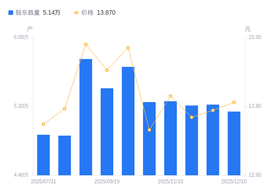近一年(2024年12月10日至2025年12月10日),安洁科技A股股东户数从5万户,增加至5.14万户,增幅2.80%,区间股价下跌14.28%。