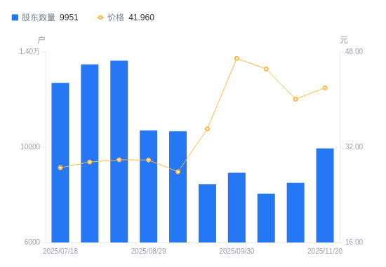近一年(2024年11月29日至2025年11月20日),唯特偶A股股东户数从7255户,增加至9951户,增幅37.16%,区间股价上涨100.58%。