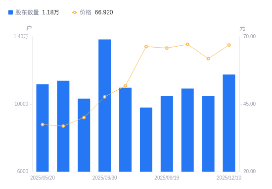 近一年(2024年12月20日至2025年12月10日),凯格精机A股股东户数从1.33万户,减低至1.18万户,降幅11.40%,区间股价上涨98.40%。