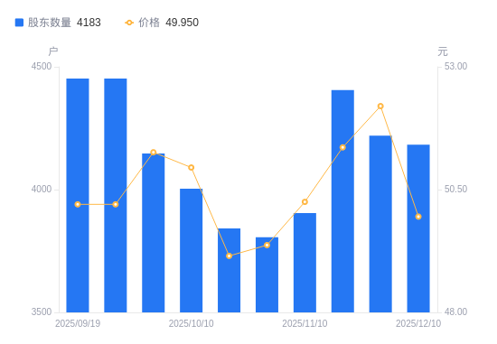 近一年(2024年12月10日至2025年12月10日),浙江正特A股股东户数从5761户,减低至4183户,降幅27.39%,区间股价上涨82.30%。