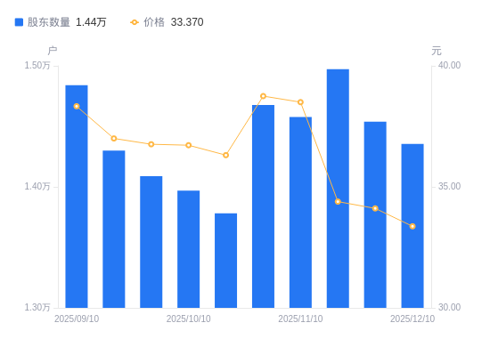 近一年(2024年12月10日至2025年12月10日),金凯生科A股股东户数从1.22万户,增加至1.44万户,增幅17.41%,区间股价上涨8.63%。