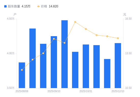近一年(2024年12月31日至2025年12月10日),株冶集团A股股东户数从4.47万户,减低至4.15万户,降幅7.23%,区间股价上涨82.51%。