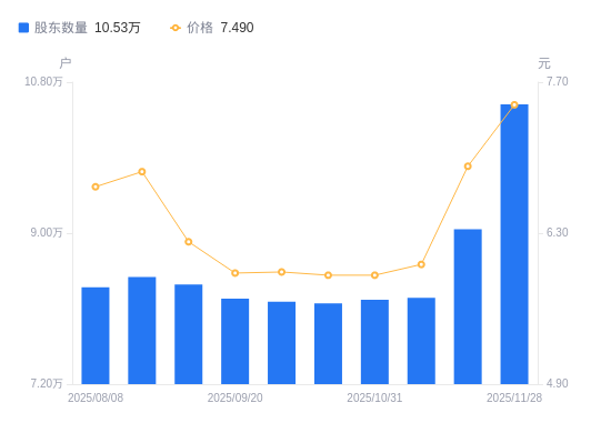 近一年(2024年12月10日至2025年12月10日),亚光科技A股股东户数从8.76万户,增加至10.44万户,增幅19.19%,区间股价上涨10.91%。