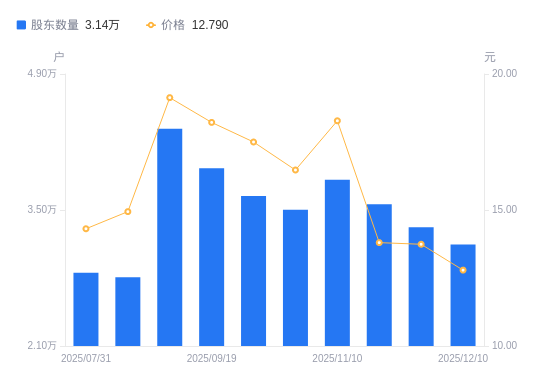 近一年(2024年12月20日至2025年12月10日),科创信息A股股东户数从2.62万户,增加至3.14万户,增幅20.21%,区间股价下跌8.38%。