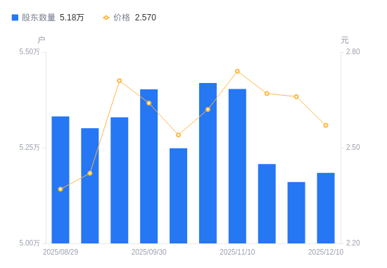 12月15日消息,数据显示,截至2025年11月10日,云南城投A股股东总户数为5.4万户,较上期(2025年10月31日)减少157户,降幅0.29%。公司最新A股总股本为16.06亿股,其中流通A股16.06亿股,户均持有流通A股数量为2.97万股,较上期增加86.09股,增幅0.29%;户均持流通A股市值8.14万元,较上期增加3791.36元,增幅4.88%。