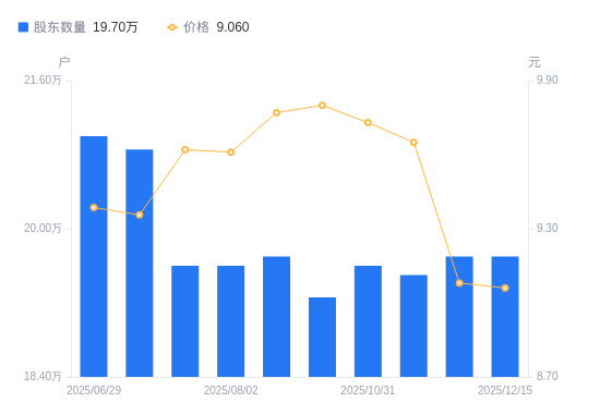 近一年(2024年12月20日至2025年12月12日),新希望A股股东户数从19.3万户,增加至19.7万户,增幅2.07%,区间股价下跌3.26%。