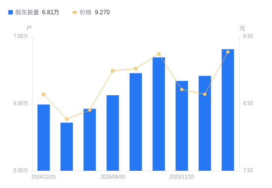 近一年(2024年12月31日至2025年12月10日),聚灿光电A股股东户数从5.99万户,增加至6.81万户,增幅13.75%,区间股价上涨7.49%。