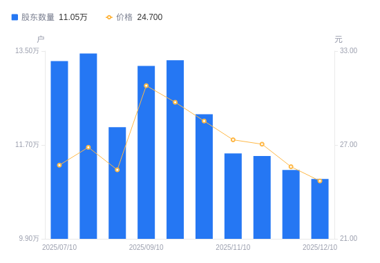 近一年(2024年12月10日至2025年12月10日),深圳华强A股股东户数从13.59万户,减低至11.05万户,降幅18.73%,区间股价下跌2.72%。