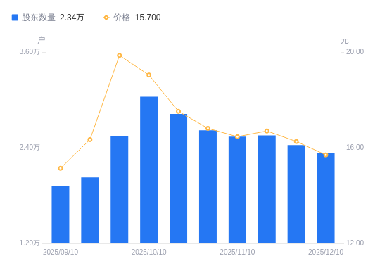 近一年(2024年12月20日至2025年12月10日),国林科技A股股东户数从2.91万户,减低至2.34万户,降幅19.57%,区间股价下跌0.32%。