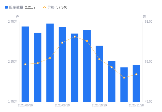 近一年(2024年11月20日至2025年11月20日),丰立智能A股股东户数从2.11万户,增加至2.18万户,增幅3.40%,区间股价上涨10.43%。