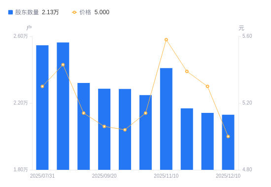 近一年(2024年12月31日至2025年12月10日),同德化工A股股东户数从1.7万户,增加至2.13万户,增幅25.04%,区间股价上涨0.20%。