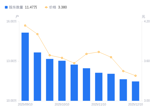 近一年(2024年12月10日至2025年12月10日),大东南A股股东户数从6.42万户,增加至11.47万户,增幅78.72%,区间股价上涨13.80%。