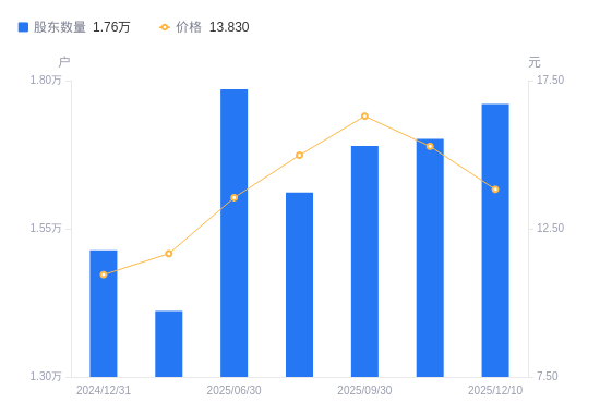 近一年(2024年12月31日至2025年12月10日),振华新材A股股东户数从1.51万户,增加至1.76万户,增幅16.31%,区间股价上涨22.07%。