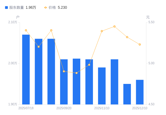 近一年(2024年12月10日至2025年12月10日),永清环保A股股东户数从2.22万户,减低至1.96万户,降幅11.71%,区间股价下跌5.99%。