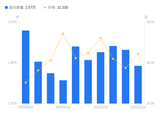 近一年(2024年12月20日至2025年12月19日),依依股份A股股东户数从1.71万户,减低至1.57万户,降幅8.12%,区间股价上涨95.30%。